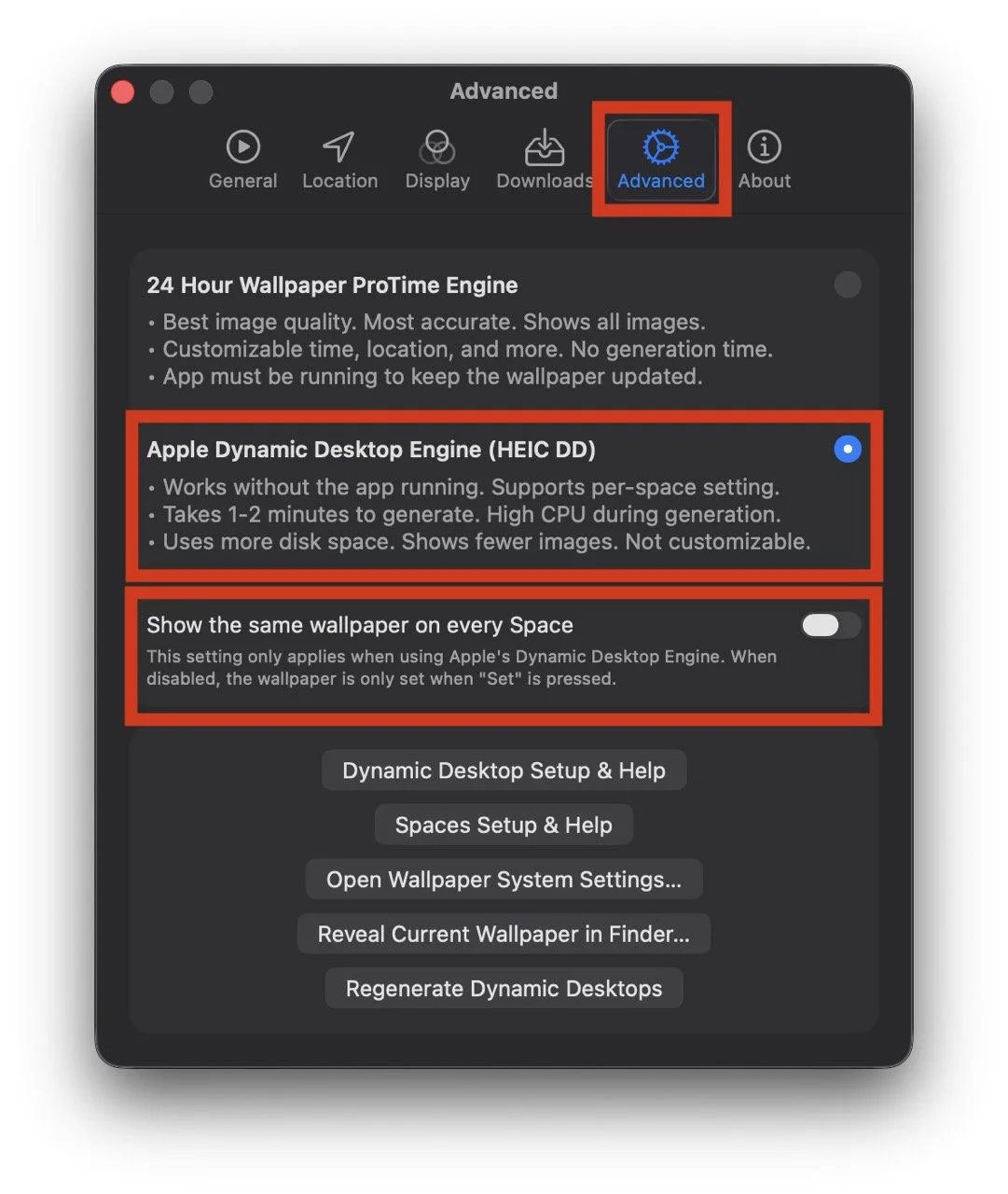 Open 24 Hour Wallpaper Settings and select the Advanced tab (in older versions of the app, the tab is labeled “Dynamic Desktop.”)