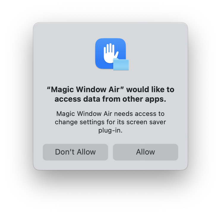 In macOS Sonoma, Apple introduced a warning dialog when one app attempts to access files in another app. In the case of Magic Window Air, there are actually two apps - the app itself, and the plug-in. So when you hit the settings button in the Airport pop-over to edit the plug-in settings, this dialog will be displayed.