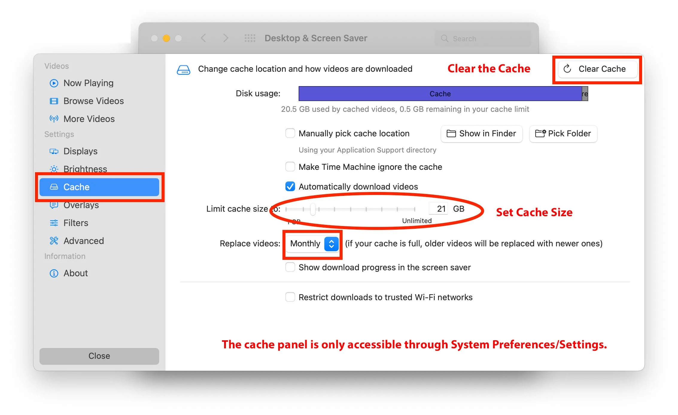 You can set a limit on the maximum amount of disk space for downloads to use on the Cache panel. You can also disable automatic downloads to prevent the app from consuming more space. To get to the Cache panel, you must access Screen Saver Settings through the System Preferences/System Settings panel.
