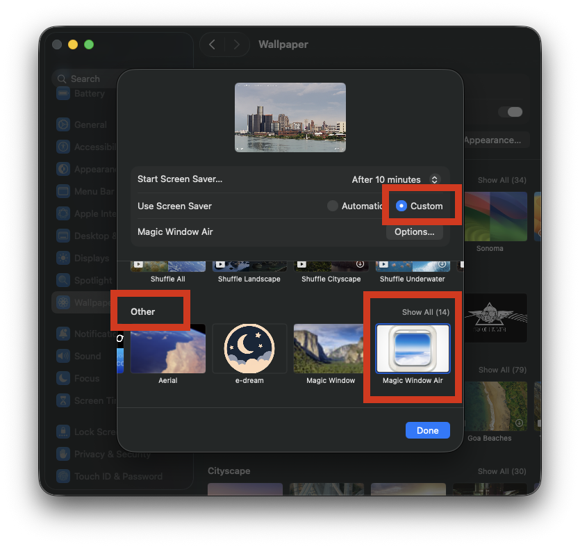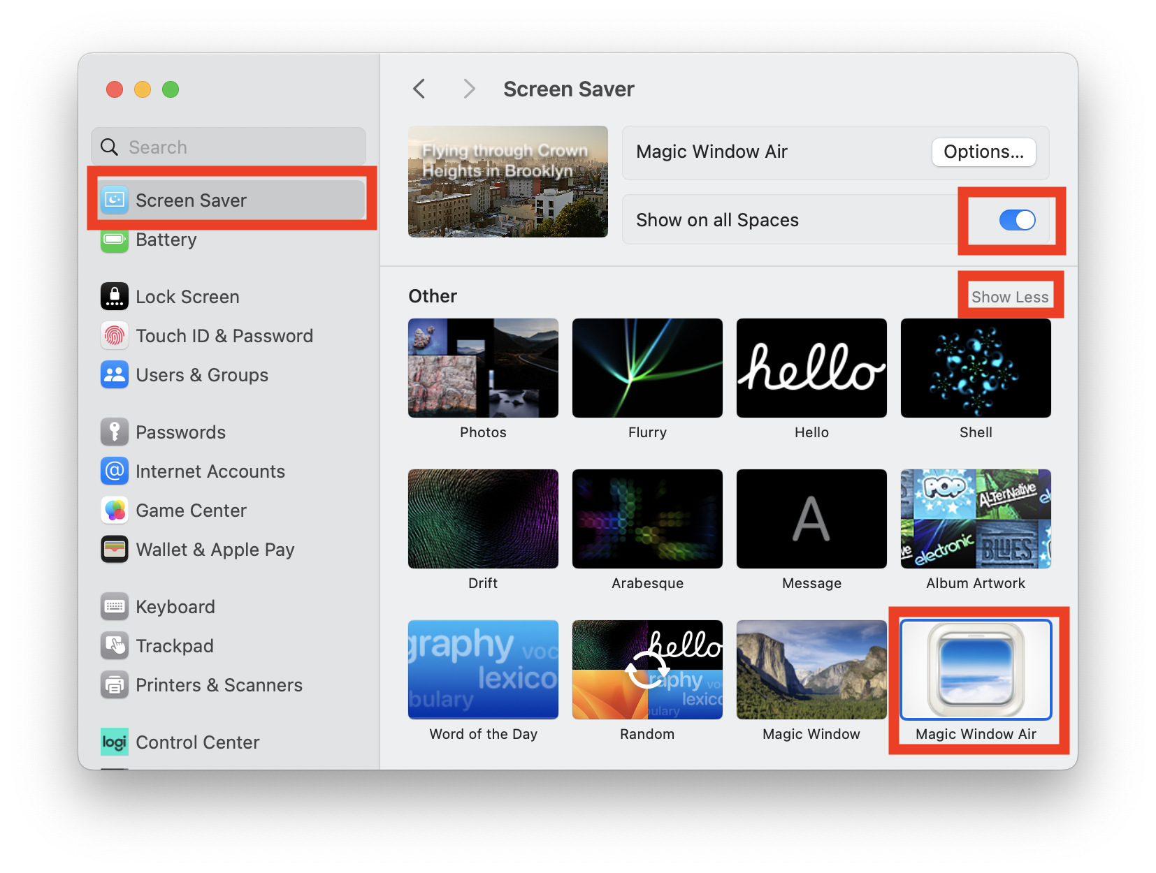 With Magic Window Air selected, press Options or Screen Saver Options.