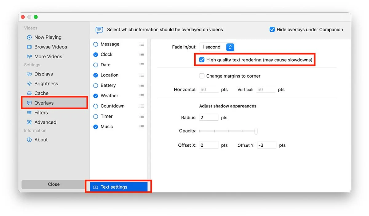 Due to performance issues on certain Mac models, the title and other text you see overlaid on the Screen Saver is 1x resolution by default. If you have a Mac with a discrete GPU you can change this option and will likely not encounter problems. To enable 2X text: