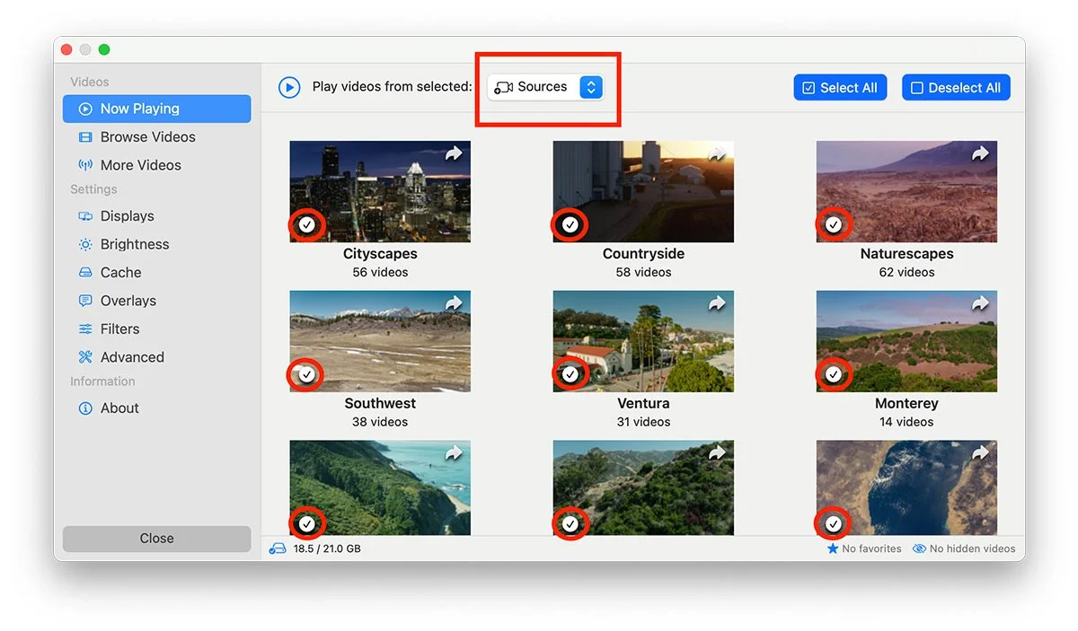 The videos downloaded by the Screen Saver will vary in size depending on what format you have selected. Here are the total sizes for each format option: 4K - 20GB, HD HEVC (SDR) - 10GB, HD H264 - 10GB